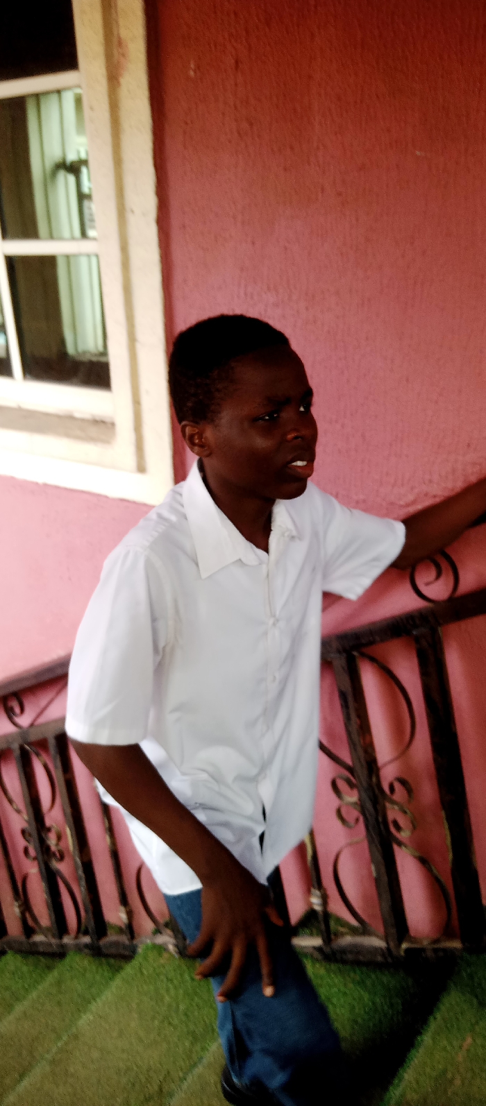 The image features a male youth, dark-skinned with short dark hair, positioned in a sheltered outdoor or semi-enclosed setting. He is wearing a white short-sleeved collared shirt with buttons and dark blue jeans. The individual is oriented slightly to the viewer's right, with his head turned and mouth slightly open, suggesting mid-speech or reaction. His left hand is resting on a black metal railing characterized by decorative scrollwork, while his right hand is placed on his right thigh. The background consists predominantly of a textured, salmon-pink wall. In the upper left portion of the image, a white-framed window with multiple glass panes is visible, set within a lighter, possibly cream-colored, architectural trim. The lower foreground depicts a green, artificial turf-like surface, which appears to be part of a staircase or ramp. The specific location within Onitsha, Nigeria, is not visually identifiable from the image content.