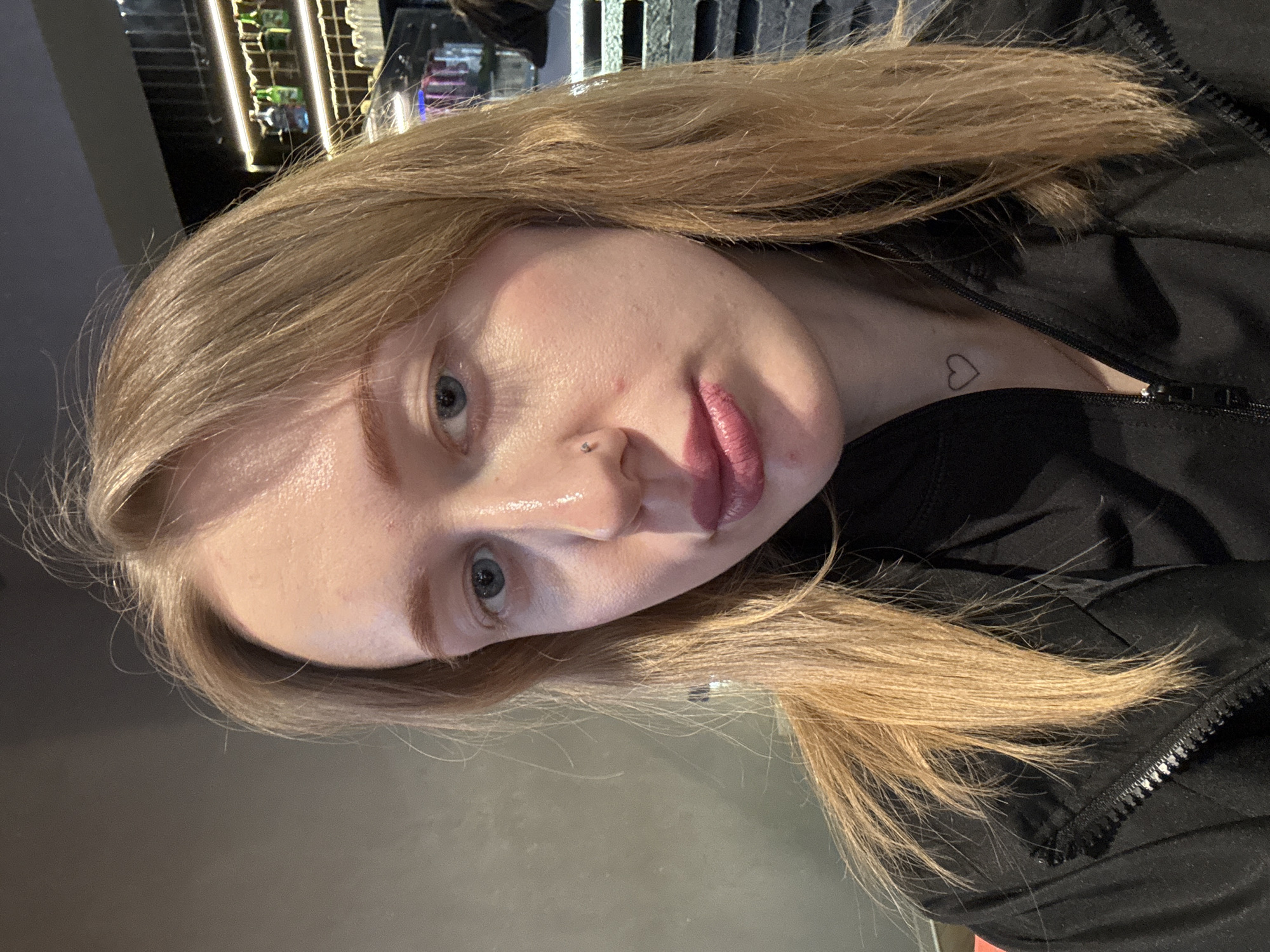 A close-up, rotated selfie of a blonde-haired person with fair skin