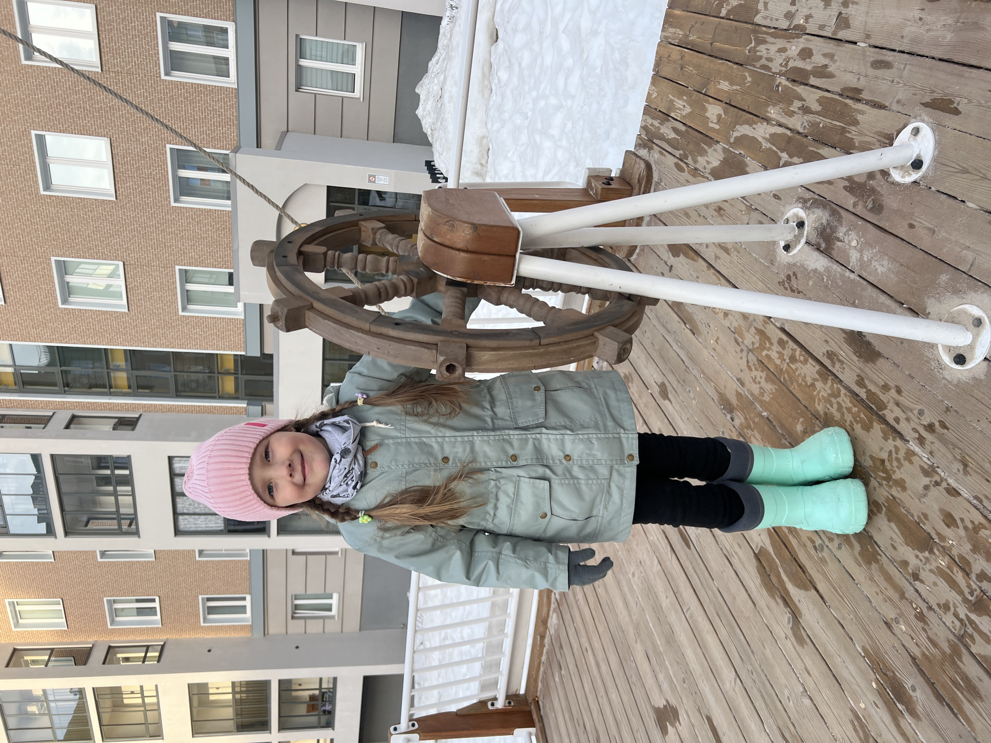 An outdoor scene in Pervomaysky, Russia, depicts a young female child standing on a wooden deck next to a large, freestanding wooden ship's steering wheel. The child, estimated to be 4-7 years old, wears a pink knit beanie, a grey patterned neck gaiter, a light green winter jacket with brass-colored snap buttons, dark grey gloves, black pants, and mint green insulated rubber boots. Her light brown hair is styled in two pigtails with colorful bands. She is smiling and looking directly at the camera, with her left hand resting on the ship's wheel. The wheel has multiple spokes and is mounted on a stand with brown wooden uprights and three white metal legs secured to the weathered wooden deck, which shows wet spots and some sandy residue. A white railing is visible behind the child to the left. Beyond the railing and to the right of the ship's wheel, the ground is covered with extensive, uneven piles of snow. A thick rope extends diagonally upwards from behind the wheel towards the upper right of the frame. In the background, several modern multi-story apartment buildings with light-colored facades, light brown brick sections, and numerous windows with dark frames are visible, suggesting a residential complex.