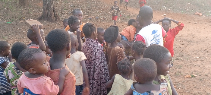 Konongo, Democratic Republic of the Congo. An outdoor scene shows a dense gathering of approximately 20-30 individuals, primarily children and adolescents, on reddish-brown dirt. In the left foreground, a young child is carried on another's back, secured by a patterned fabric wrap. Directly behind, a child carries a rectangular wooden board on their head, supported by their right hand. Centrally, an individual wears a white vest with red trim, displaying a blue logo and the text "ANDREA-2022." This individual, with their back partially to the viewer, interacts with the surrounding crowd. To their right, an adolescent in a red long-sleeved shirt stands with hands on their head, looking forward. Numerous other children in varied casual attire are tightly grouped, looking in multiple directions, with some smiling. The background features a large tree trunk on the left and sparse dry vegetation on the right. Additional children are visible in the distant background. The scene is illuminated by natural daylight.