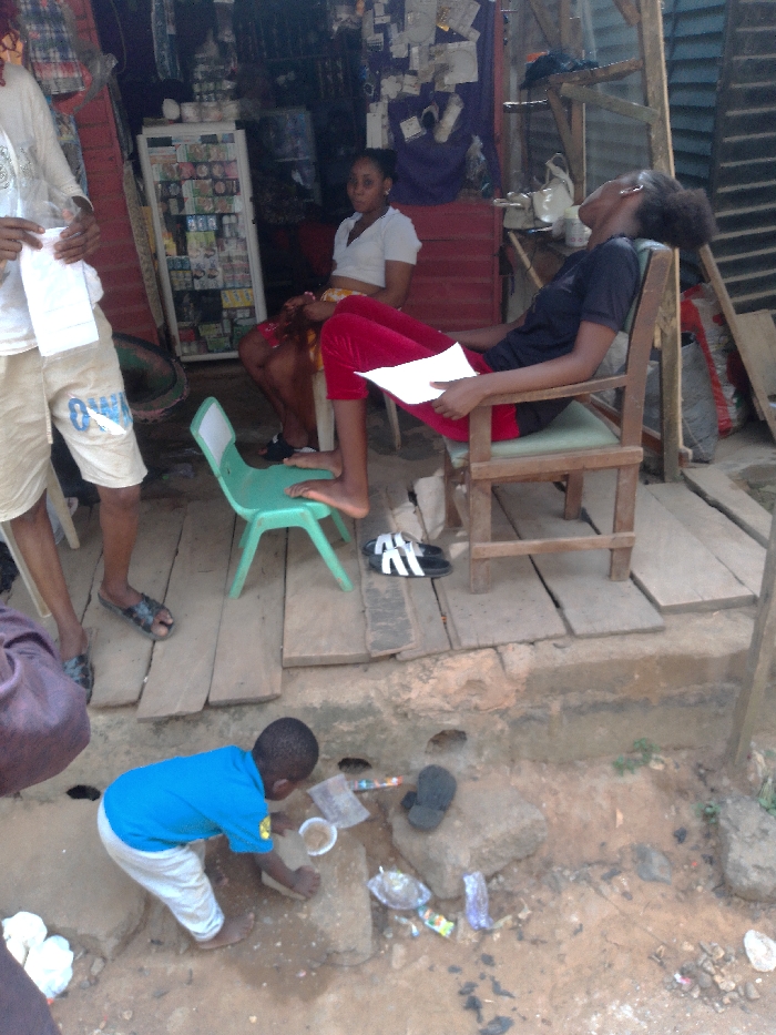 A small boy wearing a blue shirt and white pants plays with a cup on the ground amid trash. A girl in red pants sits with her feet on a small green chair. Another girl in a white shirt sits behind her. A taller person leans back in a wooden chair holding a paper. Another man is standing beside the group holding a paper as well. There is a shop behind them.