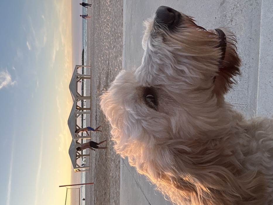 The image captures a Tel-Aviv beach scene during sunset. In the immediate foreground, the right profile of a light-colored, long-haired dog, possibly a Goldendoodle, is prominent, with its right eye looking towards the camera. The dog is positioned on a light grey concrete surface. Beyond the dog, a sandy beach extends towards the Mediterranean Sea. On the left side of the beach, a volleyball net with red poles is erected. Two adult males are actively engaged in playing volleyball near the net; one wears dark shorts, the other blue shorts. Further down the beach, three identical, open-sided beach shelters with peaked, light-colored roofs are visible, evenly spaced. To the far right, two additional individuals are walking along the water's edge. The sea in the background shows a calm surface, and a distant rock breakwater is visible. The sky transitions from a warm orange and yellow at the horizon, indicative of sunset, to a lighter blue with sparse clouds overhead.
