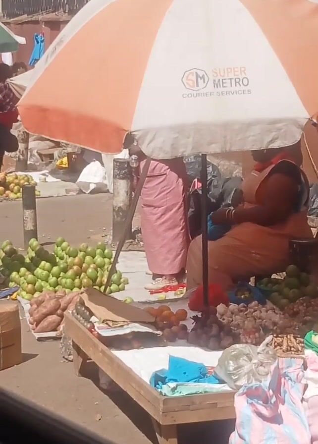 small street-side fruit and vegetable stand being manned by a woman, likely a vendor. The vendor is under a large orange and white umbrella with a courier service logo on it. A man in an orange shirt appears to be inspecting or potentially buying items from the vendor's display. The stand is located on what appears to be a city street, evident from the sidewalk and nearby buildings. The stand has a variety of produce including green fruits, onions, oranges, sweet potatoes, and other vegetables displayed on wooden platforms and in piles. There is a bag in the background, possibly containing more stock or personal belongings. A barbed wire fence is visible in the background. The video appears to be shot from inside a car, as suggested by the dark frame on one side.