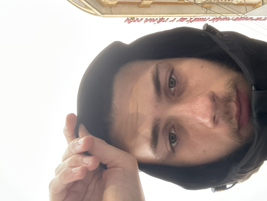 A male individual, approximately early to mid-20s, with light skin, greenish-hazel eyes, and stubble on his chin and upper lip, looks directly into the camera