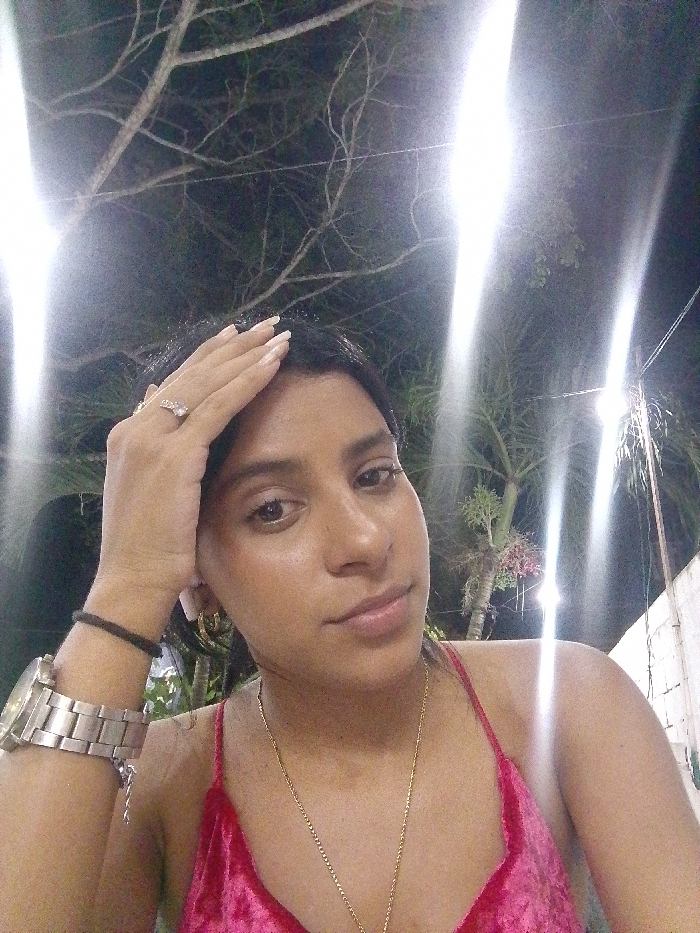 An image captured at night in Los Chacos, Venezuela, depicts a female subject in a close-up portrait, oriented to the viewer. She presents with dark hair and a medium complexion, looking directly at the camera with a neutral expression. She wears a pink, possibly velvet, camisole top and a thin gold-colored chain necklace. Her left hand is raised, with manicured, light-polished fingers resting on her forehead. A ring with a clear stone is worn on her left ring finger. A large, silver-toned metal wristwatch with a link band and a thin black elastic bracelet are present on her left wrist. A gold-colored hoop earring is visible in her left ear. The background is dark, illuminated by multiple vertical artificial light flares. Visible elements include dark tree branches, some bare and some with foliage, and a light-colored wall on the far right, consistent with an outdoor, nighttime environment.