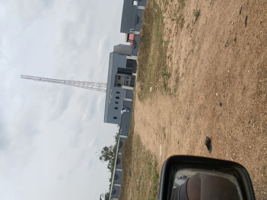 The image depicts an outdoor scene in Owo, Nigeria, captured from inside a vehicle under an overcast sky. The foreground features a reddish-brown dirt track with sparse patches of dry grass and a dark piece of debris. A black car's left side mirror is visible in the bottom-left, reflecting a human leg. In the midground, a grey concrete perimeter wall with integrated black metal fencing separates the track from a property. The wall displays "HAN-860" in white text and has a partially visible blue and white banner draped over it. Behind the wall stands the "UNIFIED RADIO VISION MEDIA" building, a modern, two-story grey structure with dark accents. A tall, slender metal lattice communication tower is positioned directly behind the main building, extending into the sky. Additional grey structures, one with a red roof, are visible to the right of the main building. Sparse green vegetation and trees are present on the far left horizon.