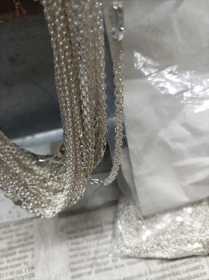 A close-up image of a silver chain, the image is taken inside. The chain is in the foreground, with a plastic bag and newspaper in the background. The chains are piled on top of each other. It is unclear whether this is in a shop or an individual's home. The exact location is unknown, however, the coordinates provided are for a residential area of Bila Tserkva, Ukraine.