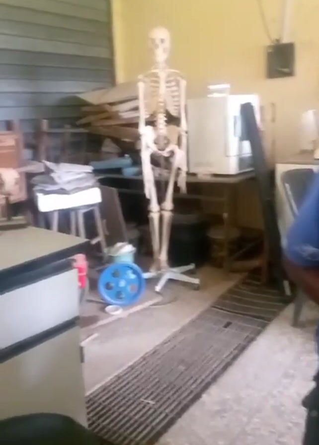 interior of a cluttered room with a skeleton standing near a laboratory workbench