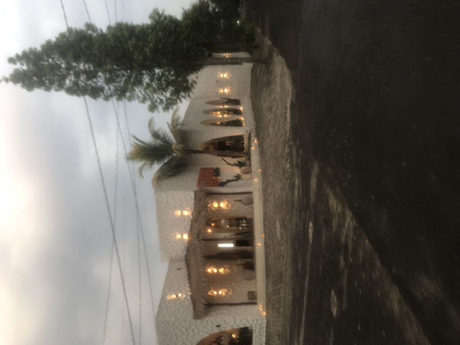 The image displays the exterior of a single-story commercial building, likely a cafe or restaurant, at dusk or night in Cianjur, Indonesia. The building features textured, white-colored walls with multiple arched windows or doorways along its facade, each illuminated by warm-toned interior lighting. A central entrance is covered by a thatched-roof awning, beneath which additional warm lights are suspended. Wall-mounted lights are affixed to the facade, casting illumination onto the textured surfaces. In the immediate foreground, a light-colored paved or gravel area directly fronts the building, marked by small, ground-level lights arranged linearly. This area abuts a dark asphalt road that occupies the lower foreground and extends to the right side of the frame. Vegetation includes a palm tree positioned directly in front of the building, slightly to the right of the thatched entrance. Taller, slender trees line the right edge of the road. Smaller potted plants or cacti are visible at the base of the building's facade. The sky above is overcast and grey, and faint power lines are visible across the upper portion of the frame. No individuals are depicted, and no active interactions are observable.