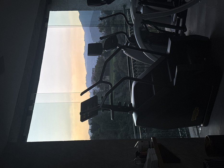 The image depicts an indoor gymnasium with a panoramic view of a mountainous, forested landscape during sunset or dusk, located in Mexico City