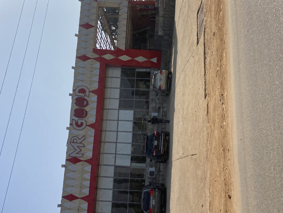 A daytime exterior view in Lugbe, Nigeria, depicts the "MR GOOD" commercial establishment