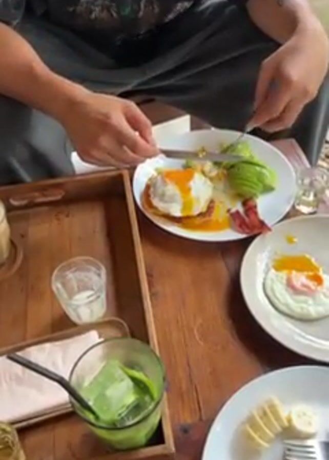 A person seated at a wooden table is cutting into a meal with a knife and fork. The meal appears to consist of eggs, avocado, and bacon, served on a white plate. There are other plates on the table, one with a fried egg, and another with banana slices and a brown spread. A wooden tray to the left holds a glass with a black straw and green liquid, another glass with a light-colored liquid, and a napkin with a small piece of cutlery. The person is wearing a dark t-shirt with a design and gray pants. A tattoo is visible on their left arm. The setting appears to be outdoors, with a soft, blurred background.