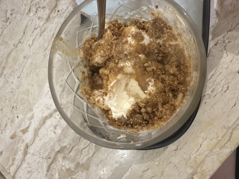 In Baan Bo Phut, Thailand, a clear glass bowl containing a partially consumed dessert rests on a polished, light-colored marble countertop featuring subtle grey veining. The dessert consists of a creamy, off-white substance, likely a dairy-based dessert or ice cream, heavily coated with brown, granular material, resembling crushed cookies or granola. A metallic spoon is partially submerged within the dessert, indicating recent consumption. The glass bowl exhibits a cut-glass pattern with diamond-shaped facets on its exterior. The scene is illuminated by an artificial light source, creating subtle reflections on the bowl and countertop. No individuals or additional objects are visible within the frame.