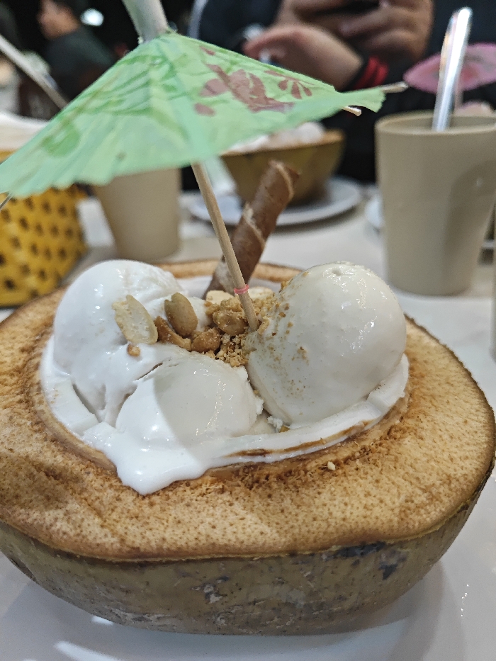 - "The image displays a close-up, high-angle view of a coconut ice cream dessert served in a halved young coconut shell, positioned on a white surface" by FM-CuMMb2, licensed under CC BY 4.0
