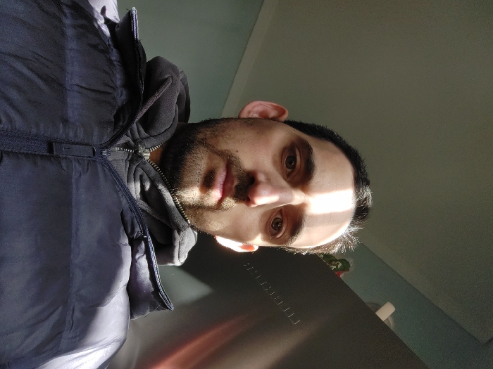 A man wearing a dark puffer jacket takes a selfie indoors. The jacket is partially zipped. He has dark hair, a beard, and brown eyes. Sunlight shines on his face, creating a bright highlight across his forehead and cheek. A grey surface is visible behind him, possibly a desk or table, and a glimpse of a wall and objects can be seen in the background. The image is rotated.