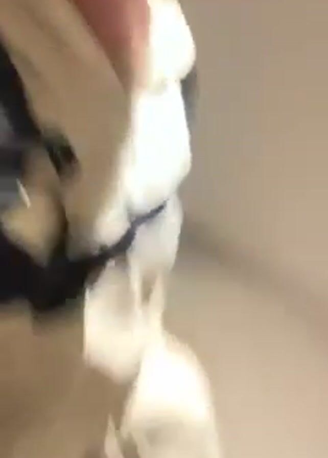 A young man with short, curly brown hair, light skin, and green eyes is filming a close-up selfie video. He is wearing a cream-colored hoodie with black wavy stripes and a black backpack. He is walking through a hallway with light-colored walls and flooring. There are signs visible on the wall behind him. His expression is neutral. He looks directly at the camera. The video appears to be taken indoors.