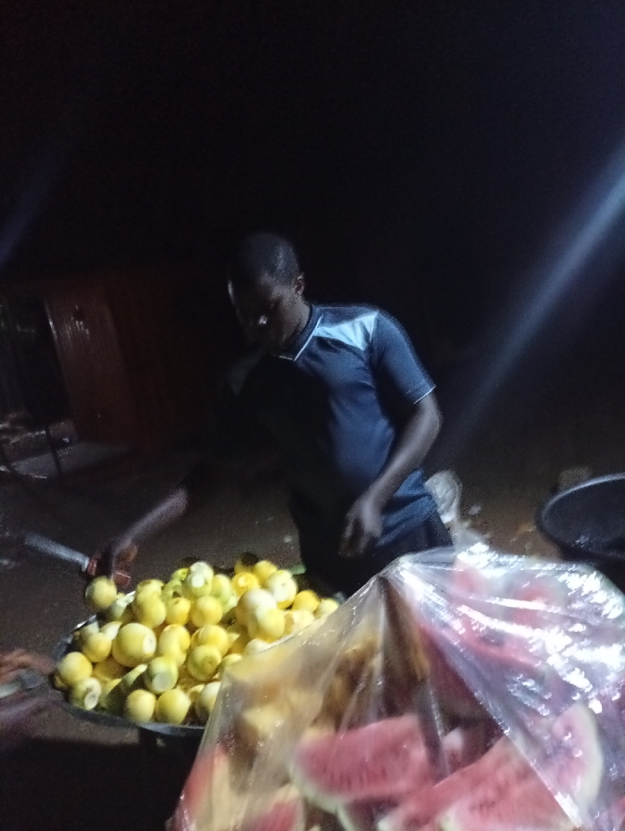 The image depicts a nighttime scene in Unguwar Gabas, Nigeria, at a fruit vendor's stall. A dark-skinned individual, wearing a dark blue t-shirt with light blue or white shoulder panels, stands behind a display of fruit, looking down at the items. On a large, round metal platter, numerous light yellow, peeled, spherical fruits are piled. To the immediate right, a transparent plastic bag contains several slices of red watermelon. Another dark-skinned hand is visible on the far left, holding a silver utensil, appearing to interact with the yellow fruits. The background is dark and indistinct, with minimal ambient light illuminating the subjects and objects.