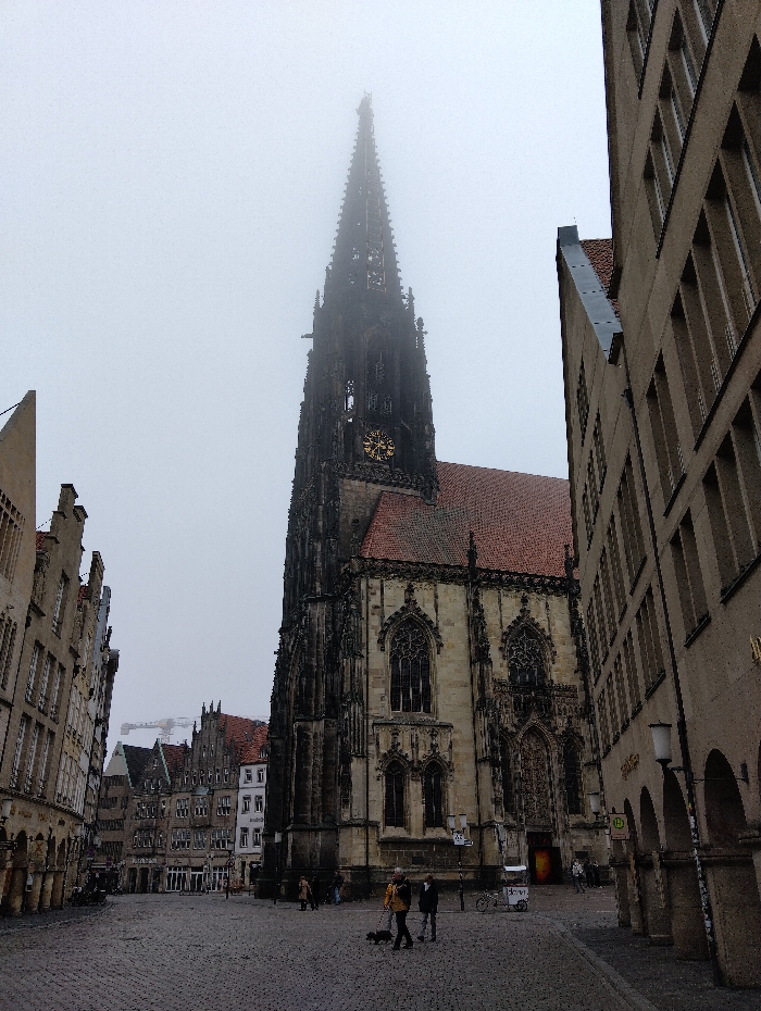 This image depicts a street scene on a foggy, overcast day in Münster, Germany, specifically featuring the St