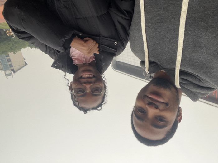 Two individuals, a woman and a man, pose for a selfie. The woman wears glasses, a pink top, and a black puffer jacket. The man is in a gray hoodie with white drawstrings. The background shows buildings under an overcast sky. The image is rotated 180 degrees.