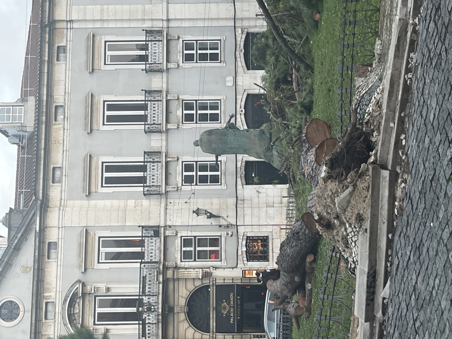A statue stands in front of a gray building with rows of windows and balconies. A fallen tree trunk and branches lie on the ground, with fresh cuts visible. The sidewalk is paved with cobblestones, and a decorative fence surrounds the green space where the tree fell. The building's entrance is marked "Palácio Chiado". The image appears to be taken from a slightly elevated position across the street.