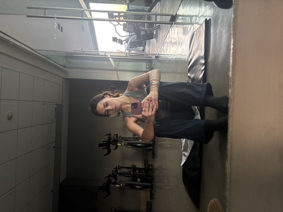 - "A female individual is depicted in a mirror selfie, seated cross-legged on a black and grey exercise mat within a modern gym in Mexico City, Mexico" by FM-RobN83, licensed under CC BY 4.0
