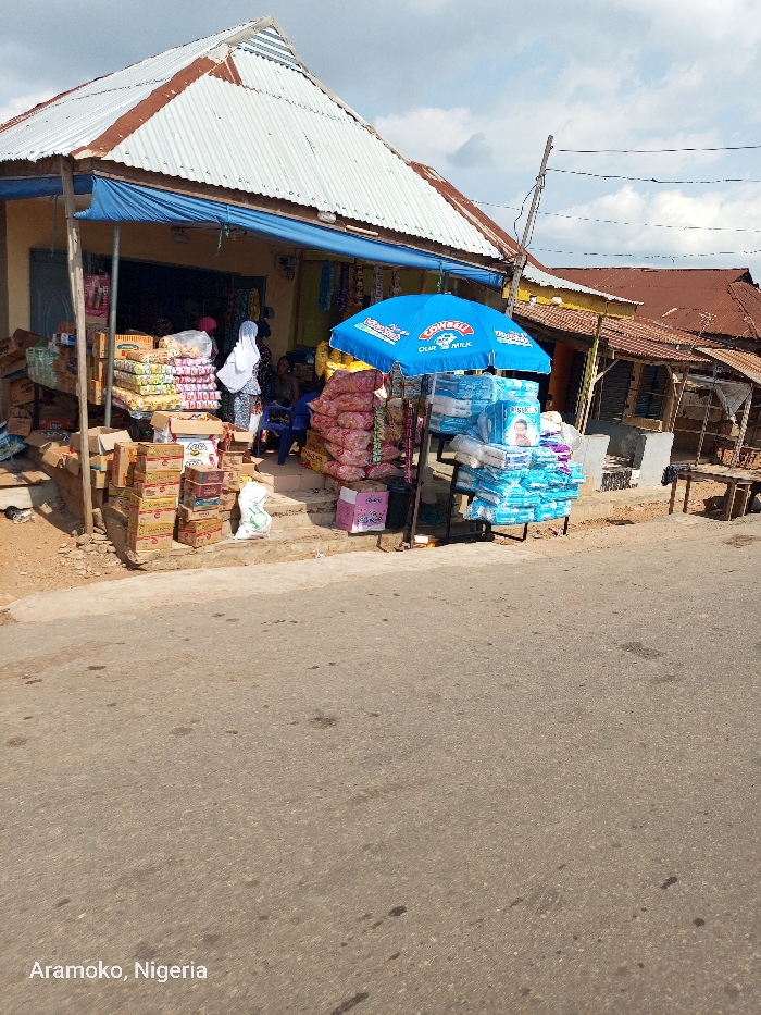 small shop with a blue awning in front of it. There are boxes of various goods stacked on the ground and a blue umbrella with a white advertisement is being used as an awning for another stall. There is a small metal rack with a variety of goods on it. The image appears to be taken in front of a shop, in the city of Ilobu, Nigeria, at the coordinates provided. The pavement in front of the shop is a dusty grey and there are a couple of people standing in front of the shop. The shop is located on a road, with other buildings visible in the background. There are power lines running along the top of the buildings, and a small street with a light grey pavement is visible in the background. The sky is a light blue with some wispy white clouds.