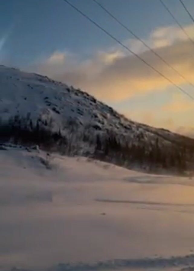 snowy landscape with power lines overhead and ski lifts in the distance. The sun is visible, with some clouds in the sky. The ground is covered in snow, with visible ski tracks and some trees and bushes partially covered in snow. At one point a skier wearing yellow and green apparel is seen.