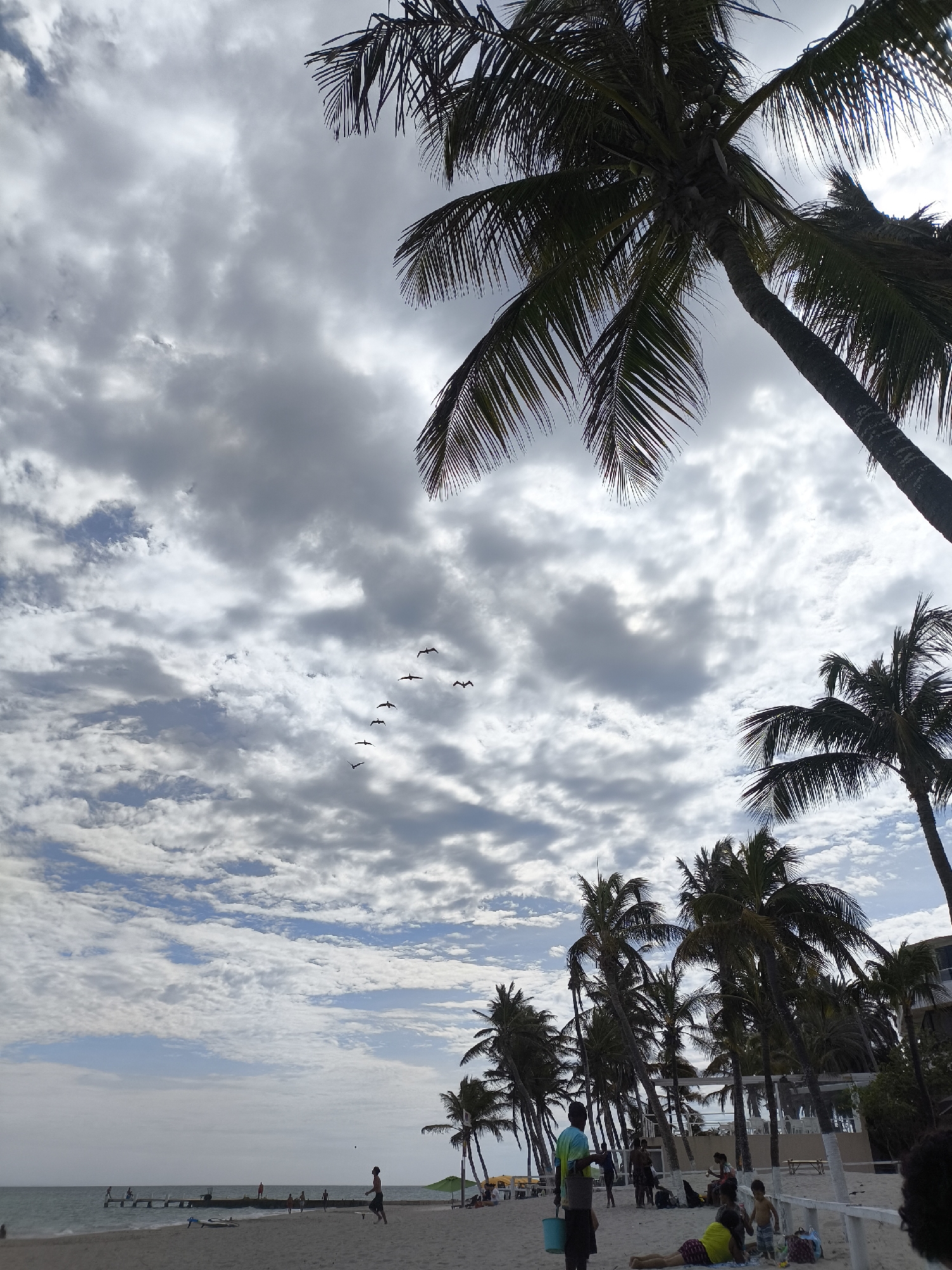 The image depicts a beach scene in El Yaque, Venezuela. The sky is mostly cloudy with patches of blue visible. A flock of birds is flying in formation in the sky. In the foreground, there's a sandy beach with several people engaged in various activities. Some people are lounging on the sand, while others are walking or playing near the water. Palm trees are scattered throughout the scene, with some towering over the beach and providing shade. A pier extends into the water in the distance. There is a building structure on the right side of the image, partially obscured by palm trees.