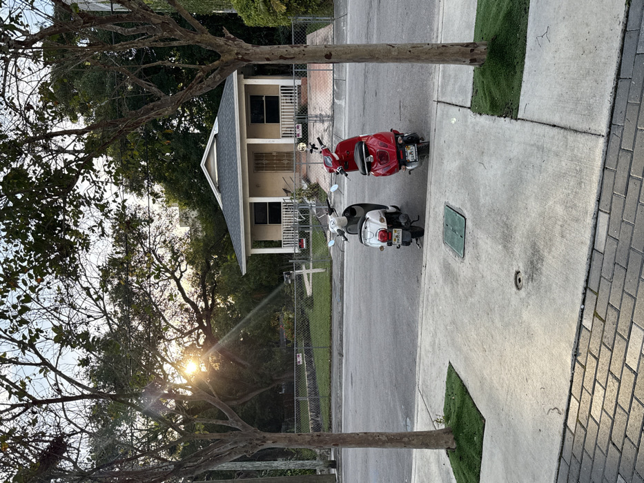 Two scooters, one red and one white, are parked on a sidewalk in front of a two-story house with a gabled roof. A chain-link fence separates the house from the street. Trees with bare branches frame the scene. The sun is setting, casting a warm glow through the trees. The sidewalk is concrete with brick edging. A green patch of grass borders the sidewalk.