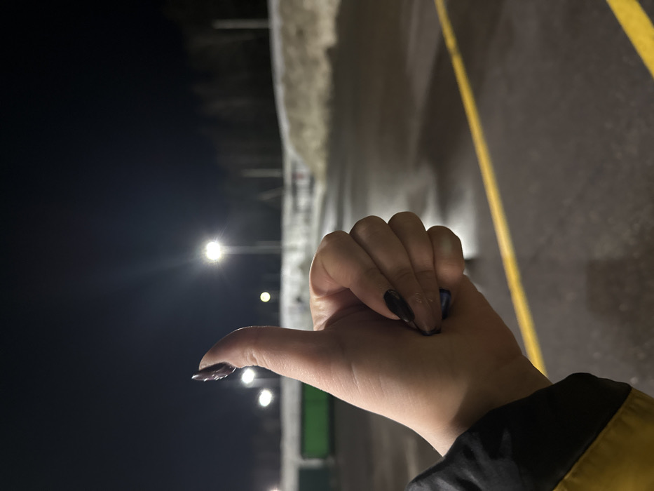The image depicts a nighttime scene in Lupanovo, Russia, specifically within an outdoor paved area illuminated by artificial light sources. In the foreground, a right hand, gloved or partially obscured by a dark sleeve with a yellow stripe, performs a "thumbs up" gesture. The hand displays dark, possibly black, artificial nails. The paved ground in the midground shows a prominent yellow dividing line. In the background, multiple bright streetlights illuminate the area. To the left, a green rectangular structure is visible. To the right, a snow-covered embankment or mound is present, with a dark treeline discernible against the night sky beyond it. The paved surface appears wet or reflective.