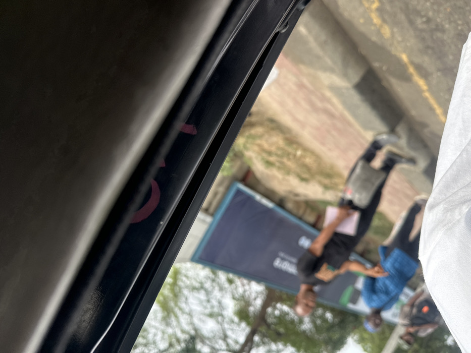The image depicts a street-level scene in Ikeja, Nigeria, observed from within a vehicle. The top portion of the frame shows the dark interior roof and window frame of the vehicle, with indistinct red markings present on the black frame. A white fabric object is visible in the immediate bottom foreground. The scene outside the vehicle is significantly tilted. On the paved sidewalk, constructed from reddish-brown and lighter-colored pavers, three male individuals are in various stages of motion. A man with a bald head, wearing a black t-shirt and dark pants, is positioned prominently, holding a light-colored document or folder in one hand and a grey bag in the other. He appears to be smiling. To his left and slightly behind, another man is dressed in a blue patterned shirt and dark pants, wearing a blue cap. A third individual, partially obscured on the far left, wears a dark top. In the background, a large, dark blue billboard stands upright, displaying white text which includes the partially legible word "REMOTE" and a green rectangular graphic. Behind the billboard and individuals, trees and foliage are visible under an overcast or diffused sky. No direct interactions between the individuals are discernible.