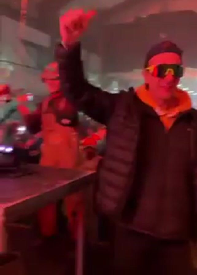 crowded party, probably indoors. A man wearing a black puffer jacket, yellow hoodie, a baseball cap, and yellow-tinted sunglasses dances with a drink in his hand. There are other people dressed in costumes dancing behind a DJ table, with the DJ operating the equipment. The scene is lit with red and white lights, creating a party atmosphere. There are balloons and decorations hanging from the ceiling. The crowd is dancing and enjoying themselves.