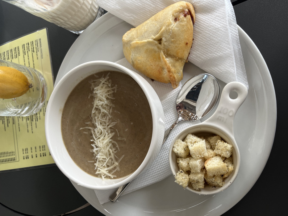 A close-up, top-down view in Rafailovići, Montenegro, displays a meal arranged on a dark table surface. A white bowl centrally features a brown, creamy soup topped with shredded white cheese. To its lower-left, a small white ceramic measuring cup, marked "100 ML," contains golden-brown croutons. A silver spoon rests between these two items, partially on a white paper napkin. To the right of the soup, a golden-crusted, triangular baked pastry with a reddish filling rests on another white paper napkin. In the upper-right background, a clear glass holds a whole yellow lemon, and a yellow menu board displays beverage categories like "COFFEE" and "SEASONAL COCKTAILS" with associated prices. A tall clear glass containing a light-colored, frothy drink with ice is positioned to the far right. All primary food items are presented on a large, round white serving plate. No individuals are visible.