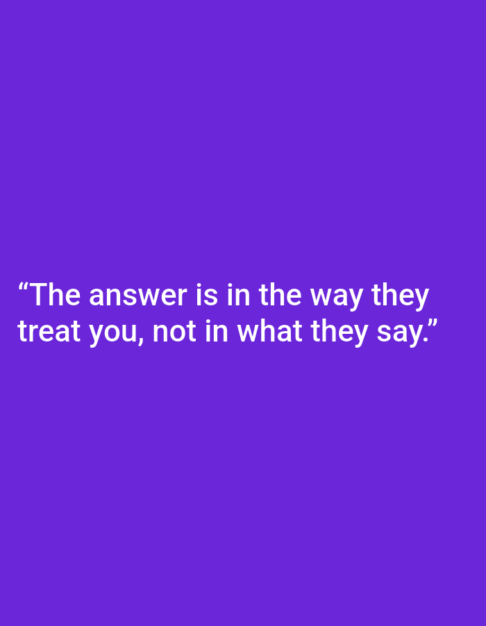 A square image with a solid purple background features white text centered horizontally and near the bottom edge. The text, enclosed in quotation marks, reads: "The answer is in the way they treat you, not in what they say." The font appears to be sans-serif and legible. The overall composition is simple, with the quote being the primary visual element.