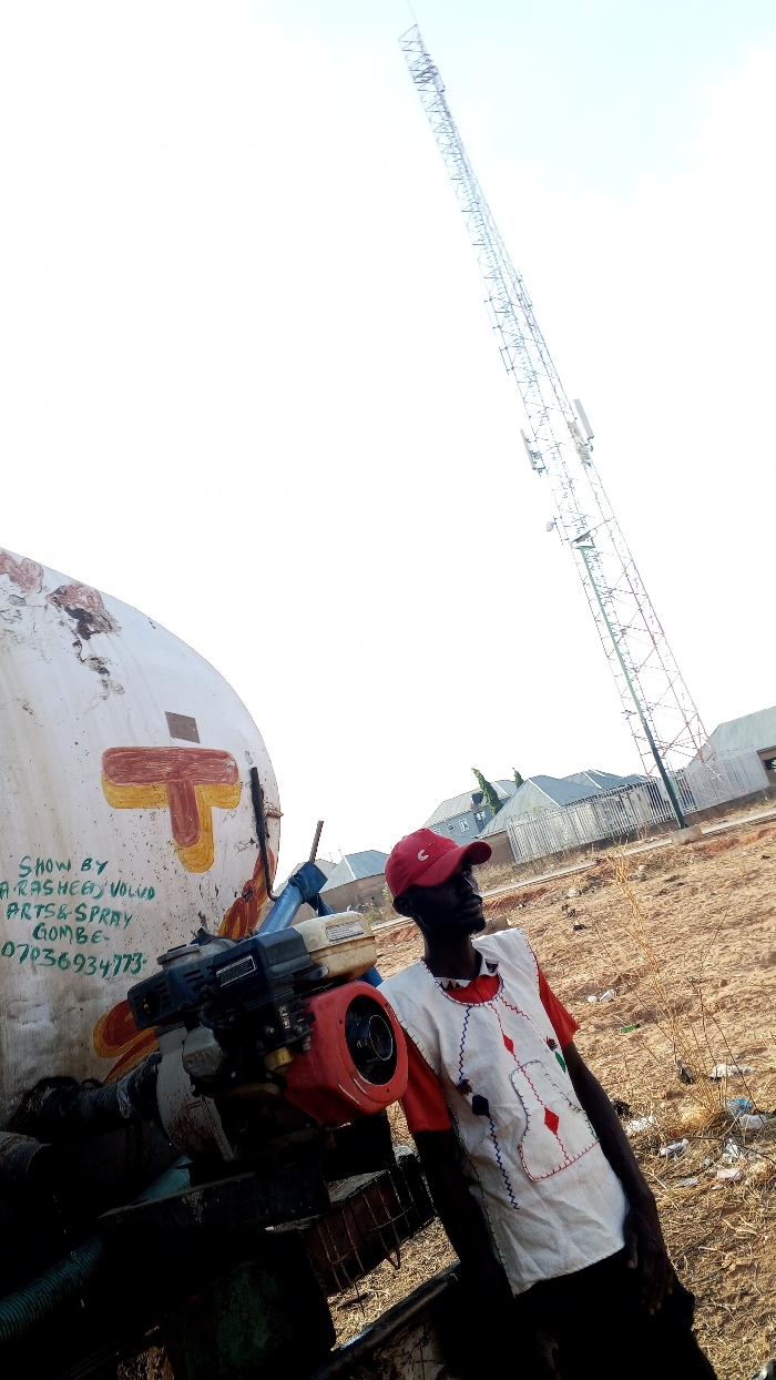 This image depicts an outdoor scene in Tempure, Nigeria. A dark-skinned male is positioned on the right side of the frame, looking slightly upward and to his right. He wears a red baseball cap, a red t-shirt, a white sleeveless tunic adorned with colorful geometric embroidery, and dark trousers. To his left, a large, cylindrical white tank is visible, bearing painted text that reads "SHOW BY A. RASHEED VOLVO ARTS & SPRAY GOMBE" and a phone number "07036934773," alongside a prominent orange stylized "T." Attached to the tank is a mechanical engine or pump unit featuring a distinctive red casing. In the background, a tall, slender lattice-structured telecommunications tower equipped with multiple antennas extends high into a bright sky. The ground beneath is dry, dusty, and sparsely covered with dry vegetation and scattered debris. Further in the background, several buildings with light-colored roofs and perimeter fences are visible.