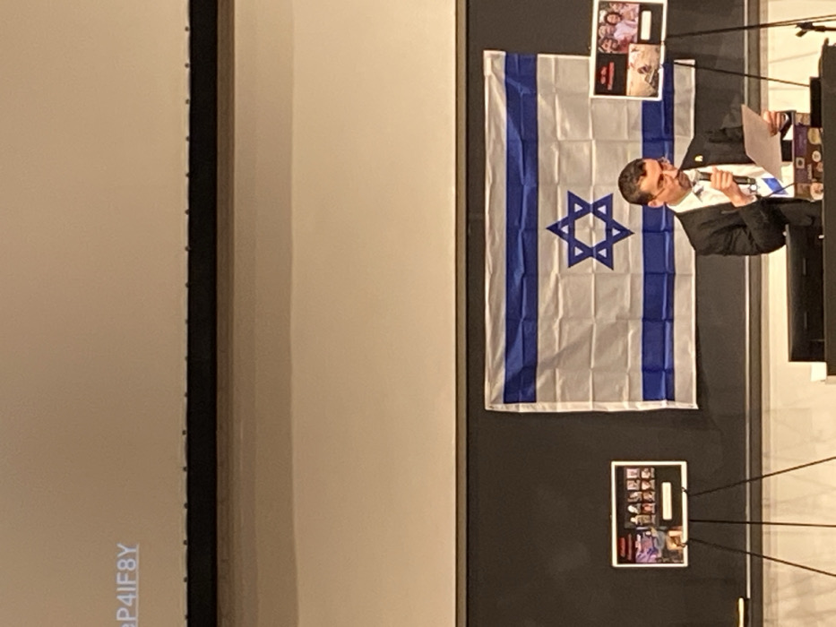 A male speaker addresses an unseen audience in an indoor lecture hall or event space in Princeton, United States. He stands behind a dark podium, holding a silver microphone in his left hand and a white paper in his right, upon which he is looking down. The speaker wears a dark suit jacket, a light shirt, a blue and white striped tie, glasses, and a mustache; a yellow ribbon or pin is affixed to his left lapel. Behind him, a large, wrinkled flag of Israel, featuring a blue Star of David on a white field with two horizontal blue stripes, is affixed to a dark gray wall. Flanking the speaker are two display easels: one on the left presenting a poster with multiple portraits and scenes, and another on the right displaying at least two photographs, including one of smiling individuals. Above the dark wall, a large, light-colored projection screen shows the partial alphanumeric code "P4IF8Y" in the upper left corner.