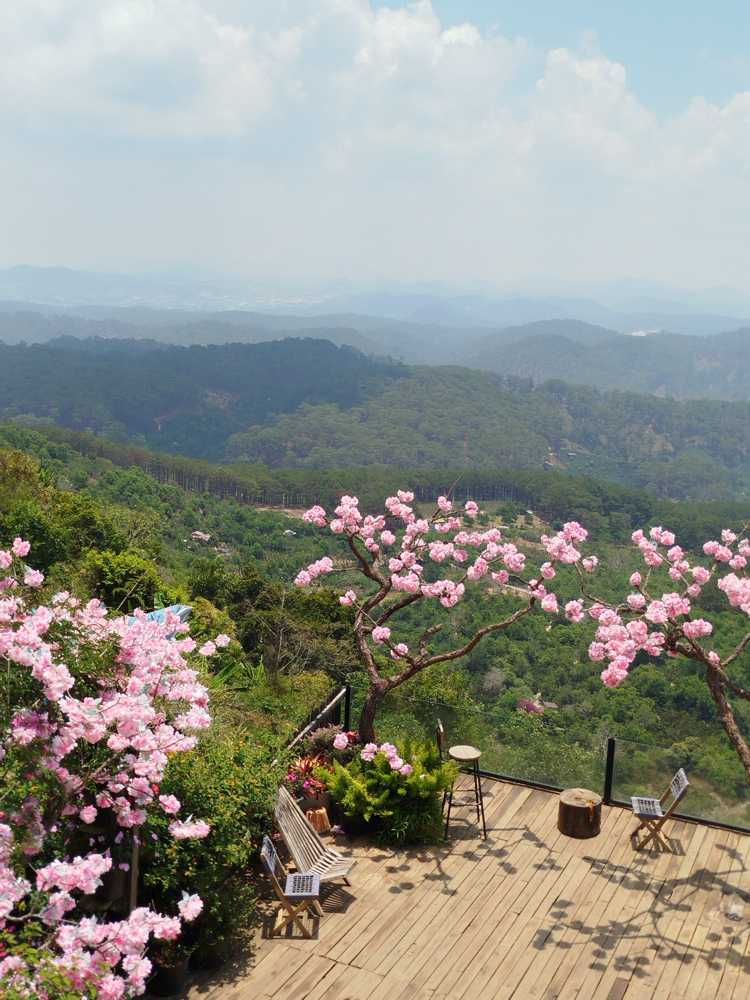 A high-angle, long-distance shot captures a wooden deck or patio area with seating, surrounded by pink flowering trees and lush green foliage, set against a mountainous backdrop. The trees, predominantly pink, are in full bloom. The deck is furnished with various seating options, including wooden chairs, a wooden bench, and a bar stool. A small tree trunk serves as a table. The scene overlooks a valley filled with dense green forests. In the distance, layered mountain ranges fade into the horizon under a blue sky with scattered clouds. The image is taken in the city of Phát Chi, Vietnam.