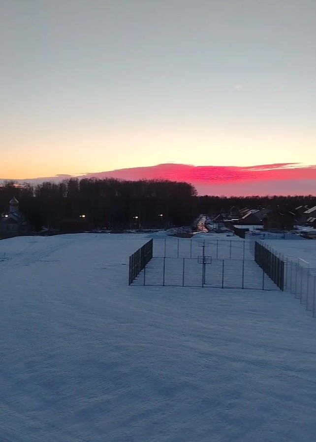 The video presents a landscape blanketed in snow, viewed from an elevated position through a window, as indicated by the glare of an interior light reflection on the glass. The scene depicts a basketball court with a wire fence enclosing it. Beyond the court, there is a treeline and a few buildings, including a church steeple on the far left. The sky is illuminated with a vivid red hue near the horizon, suggesting a sunrise or sunset. The overall mood is tranquil and serene, as captured in a wide, still shot.