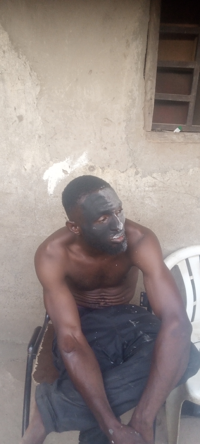 An outdoor scene in Sabon Tasha, Nigeria, depicts an adult male seated. The man is dark-skinned, shirtless, and wears dark trousers. His face is covered with a dark, opaque substance, with white streaks present around his mouth and beard. He has short dark hair and a beard. He is seated on a dark-framed chair with a white plastic seat, facing slightly right and looking upwards. His hands are clasped or resting on his lap. A second, partially visible white plastic chair is situated to his right. The background consists of a plain, light brown concrete wall exhibiting cracks and white markings. A small, dark-framed window with horizontal bars is visible in the upper right section of the wall; a small green and white object rests on its sill.