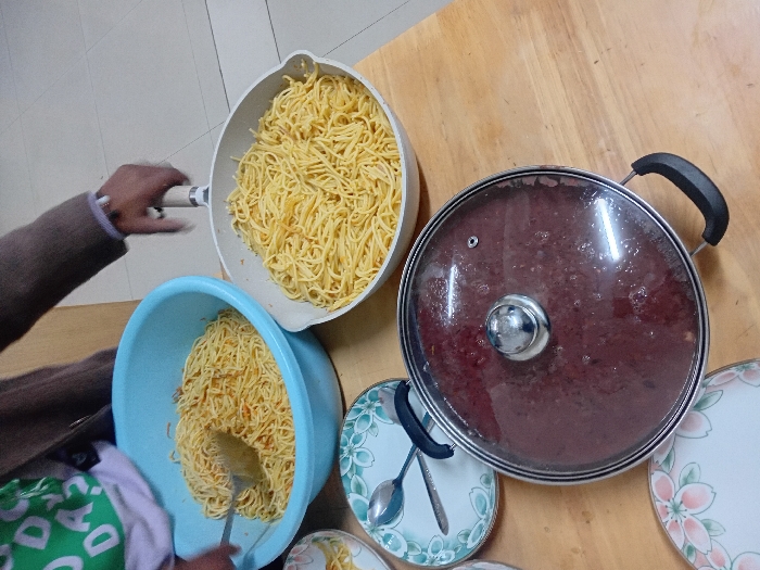 This image depicts a food preparation or serving scene inside an unspecified building in Jiangjin, China. The scene is set on a light-colored wooden table with a tiled floor visible in the background. A person, visible from the mid-torso upwards, wears a brown long-sleeved top over a green shirt with white lettering. A dark-skinned hand with a white wristband holds the light-colored handle of a white frying pan filled with a substantial quantity of cooked spaghetti. Another dark-skinned hand, partially visible, manipulates a silver spatula within a large light blue plastic bowl also containing a large portion of cooked spaghetti, which has some reddish-orange specks. A silver pot with a clear glass lid, containing a dark red, viscous sauce, is positioned prominently on the table. Condensation is visible on the interior surface of the pot's lid. To the left, two ceramic plates are visible: one light blue with green leaves and a pink flower, holding two silver spoons; and another white plate with pink floral patterns.
