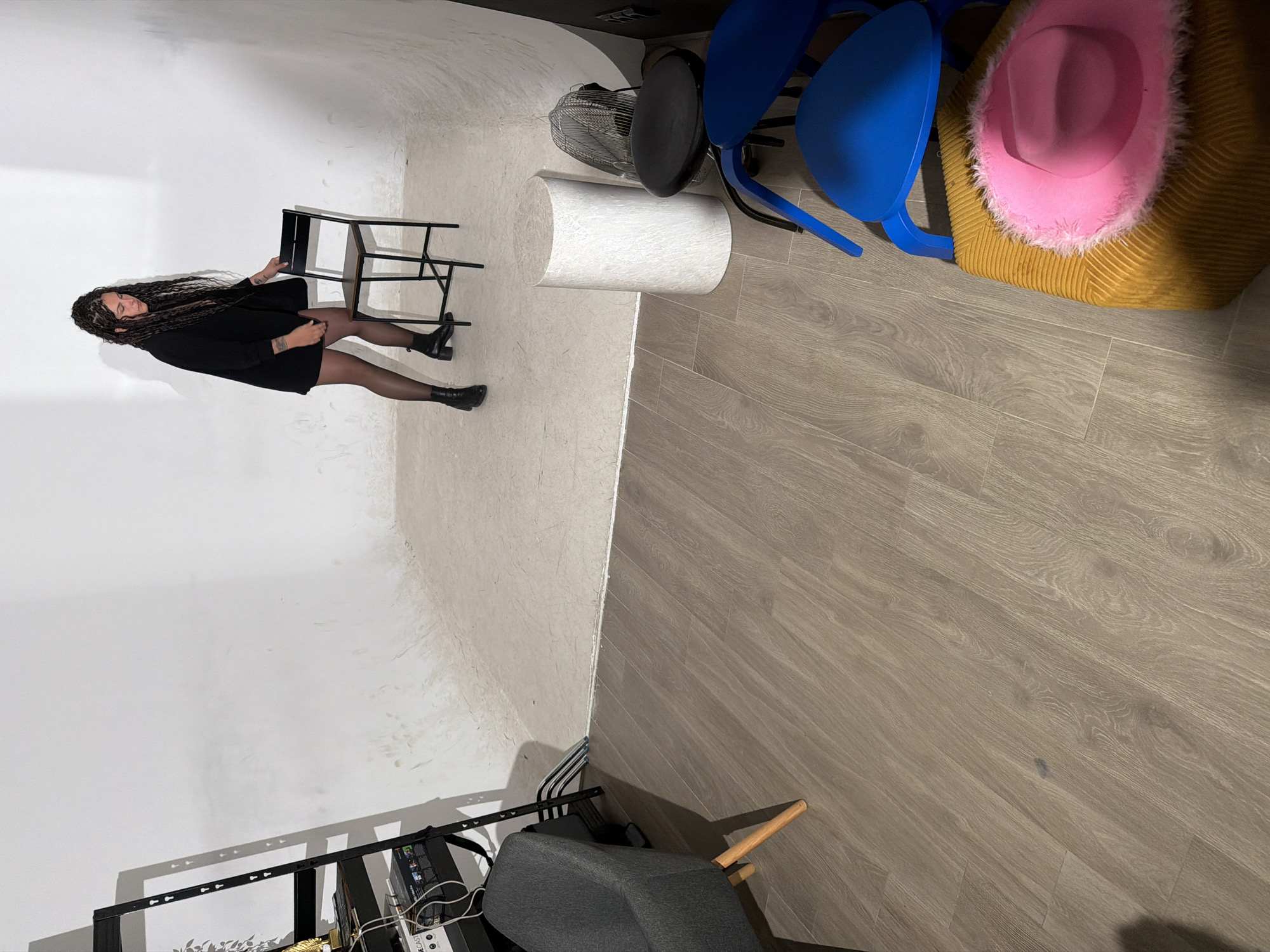 n indoor scene with a woman standing in what appears to be a studio or a large room with white walls and a light gray floor resembling wood. The woman is wearing a black dress and black stockings and is standing next to a small black table. Her hair is styled in long braids. Near her is a white cylindrical object. Further into the room, there are several blue chairs, a fan, and a yellow pouf with a pink hat on top. In the bottom left corner of the image, a black metal shelf or storage unit is visible. There is not enough information to determine that it is in Sofia, Bulgaria.