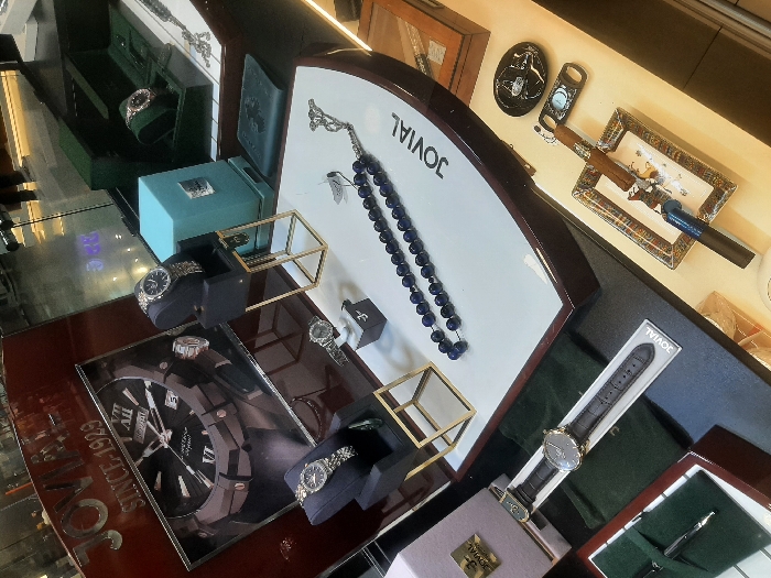 The image depicts a high-end retail display in Barza Municipality, Syria, showcasing Jovial brand watches and luxury accessories