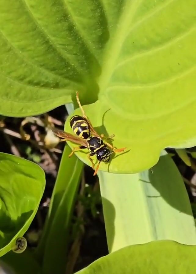- "A close-up shows a yellowjacket wasp resting on a broad, light green leaf, possibly a hosta" by FM-Kk3C43, licensed under CC BY 4.0
