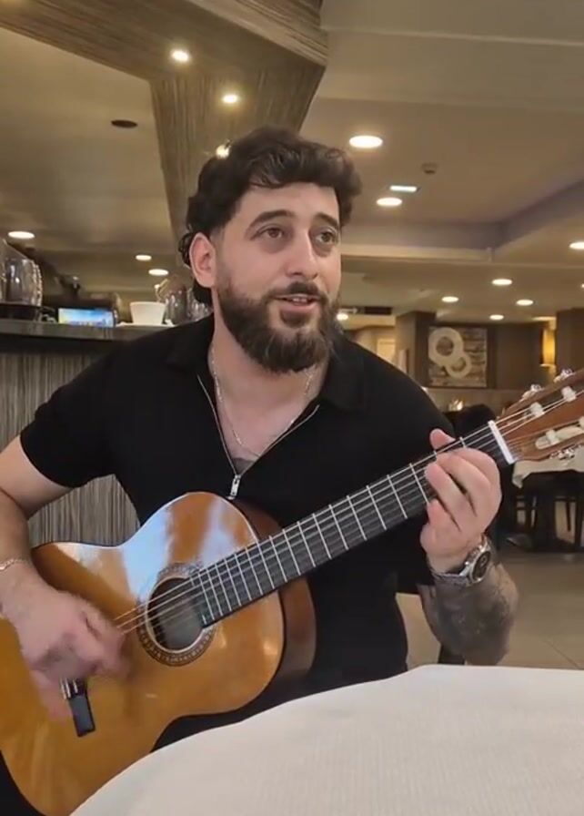 A man in a black polo shirt sits at a table in what appears to be a restaurant, playing a brown acoustic guitar. He is smiling and singing while strumming the guitar. He has dark hair, a beard, and a tattoo on his right arm. Behind him, another man in a pink shirt walks past, smiling and seemingly dancing slightly. The table has a white tablecloth. The background shows a bar area with bottles and lighting fixtures, along with other tables and chairs indicating a restaurant setting.