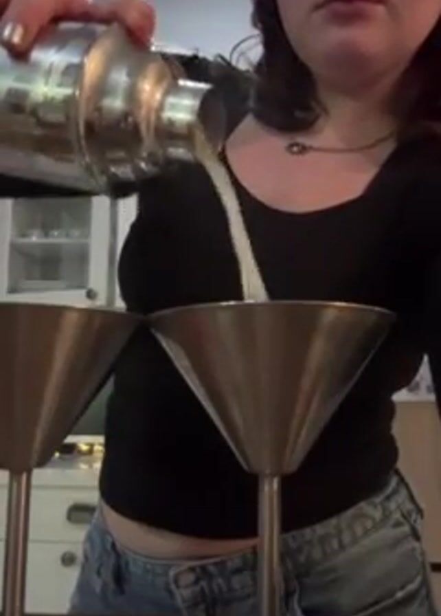 - "A woman is shown from the chest up, wearing a black long-sleeved shirt and denim shorts, pouring a clear liquid from a metal cocktail shaker into two metal martini glasses" by FM-IdNfF2, licensed under CC BY 4.0
