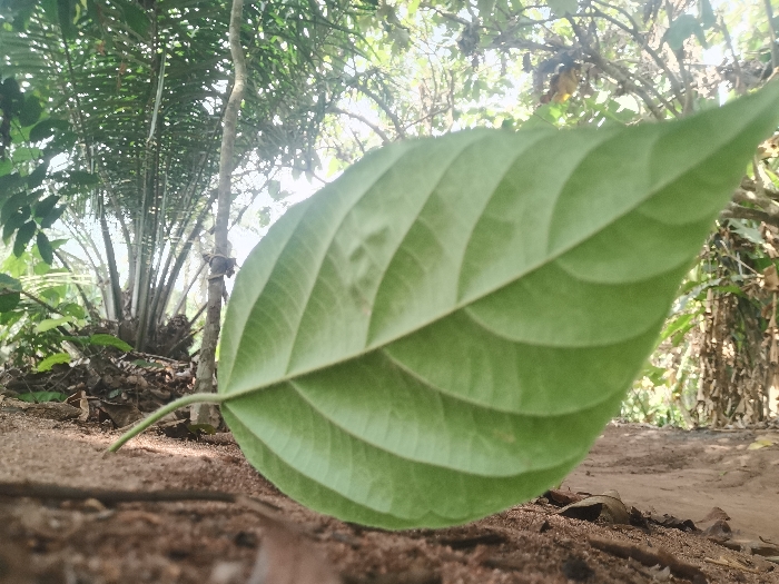 The scene depicts a natural environment within Otolokpo, Nigeria, viewed from a low perspective. In the immediate foreground, a single, large, fresh green leaf, exhibiting prominent parallel venation on its visible underside, is positioned slightly right of center. Its petiole extends towards the lower-left, touching the ground. The ground consists of reddish-brown, loose soil, with sparse organic debris including small sticks and fallen leaves. In the midground, to the left, a dense cluster of slender, upright stems characteristic of a palm tree is visible. A thin tree trunk stands to its right, with a small, indistinct dark object appearing to be tied or attached midway up. The background is dominated by a dense canopy of various green foliage and tree branches, indicating a wooded area. No individuals or specific activities are observed.