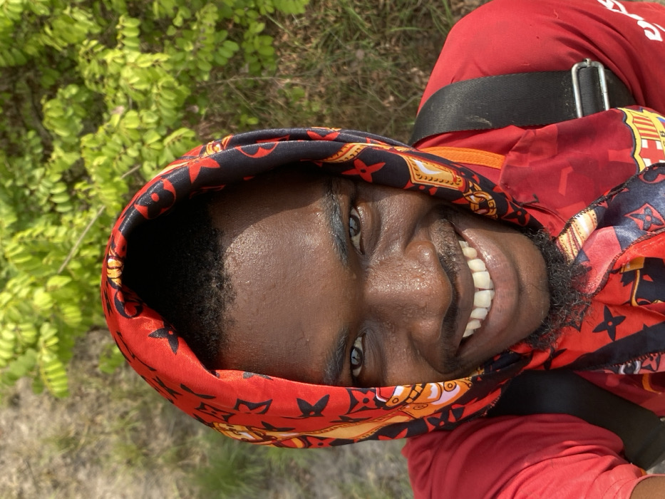 A single adult male is depicted in a close-up, high-angle portrait, smiling directly at the viewer. The individual has dark skin, short dark hair, a mustache, and a short beard. He is wearing a red short-sleeved shirt, which features a partial logo resembling the FC Barcelona crest on the lower left. A black strap, consistent with a backpack or shoulder bag, is visible over his right shoulder. His head is covered by a red and black patterned scarf, featuring gold/orange accents and motifs similar to Louis Vuitton monograms and stars, tied in a hood-like manner. His face appears slightly shiny, possibly indicating sweat. The background consists of vibrant green foliage from bushes or trees under bright daylight, with lighter ground visible beneath the greenery. The scene is located in Nguzu Edda, Nigeria.