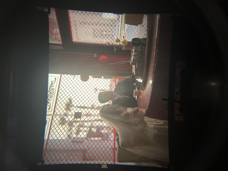 The image displays a wedding couple seated at a round, reddish-brown table inside an East Asian-themed establishment in Tel-Aviv, Israel. The scene is presented within a dark, irregular border, characteristic of a view through a camera's viewfinder, with visible dust specks and circular artifacts on the framing element. On the left, a female subject, identified as a bride, is seated. She wears a white, off-the-shoulder wedding gown and a sheer veil over her dark hair, looking towards the right. To her right, a male subject, identified as a groom, is seated. He wears a dark suit with a light tie or cravat and a boutonnière, also looking towards the right. Both individuals appear to be in their late 20s to early 30s. On the table in front of the groom, a dark, reflective oval tray holds a white tea set with gold rims, comprising multiple small cups and a teapot. A small vase with artificial yellow flowers is also present on the table to the right of the tea set. The background features large windows or glass partitions with a prominent red grid pattern. Above these, white decorative panels with intricate scrollwork are visible. Red paper lanterns are suspended as part of the interior decor, which includes deep red walls. Bright light enters the room from behind the subjects through the windows, backlighting the scene. The exterior view through the windows is indistinct, suggesting an urban setting.