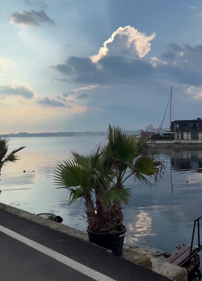 waterfront scene with a small palm tree in a black pot on the edge of an asphalt path. To the right is a calm body of water reflecting the sky and clouds above. In the distance, there's a building on the waterfront with modern architecture and several windows, along with a sailboat mast. The sky is partly cloudy with beams of sunlight breaking through the clouds. The overall scene is peaceful and serene.