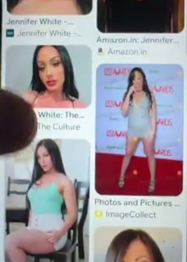 A person's finger is scrolling down a Google image search for "Jennifer White" on a smartphone. The search results show various pictures of a woman with dark hair, posing in different outfits and settings. The phone screen is visible, showing the search results and the person's finger interacting with the screen.